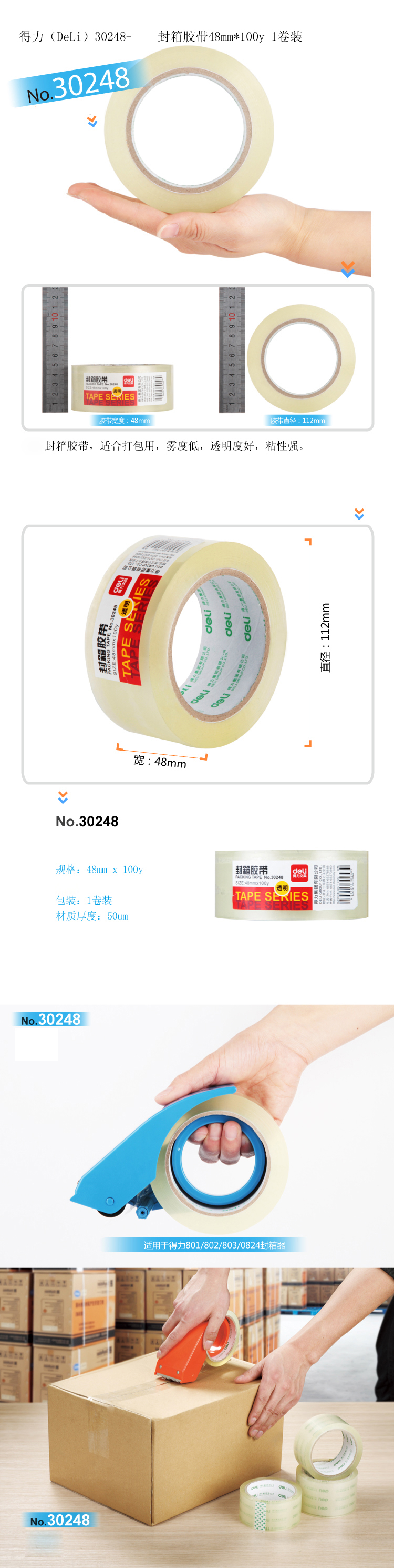 商品名称:得力30248超市封箱胶带(透明)48mm*100y*50um(卷)