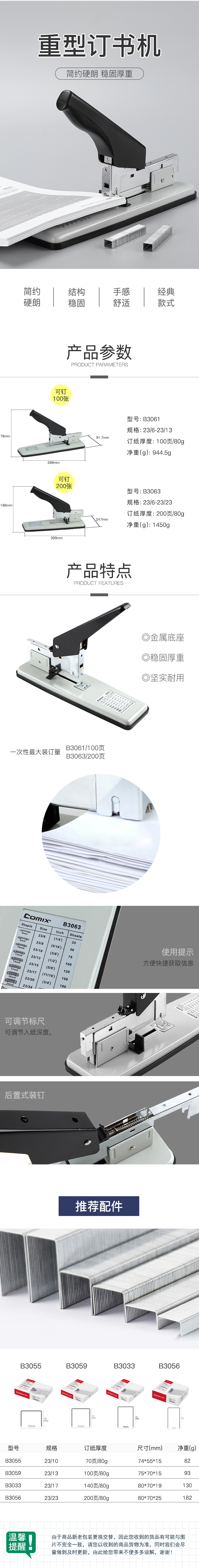 商品名称:齐心 B3061 重型订书机 100页使用23/6-23/13订书钉