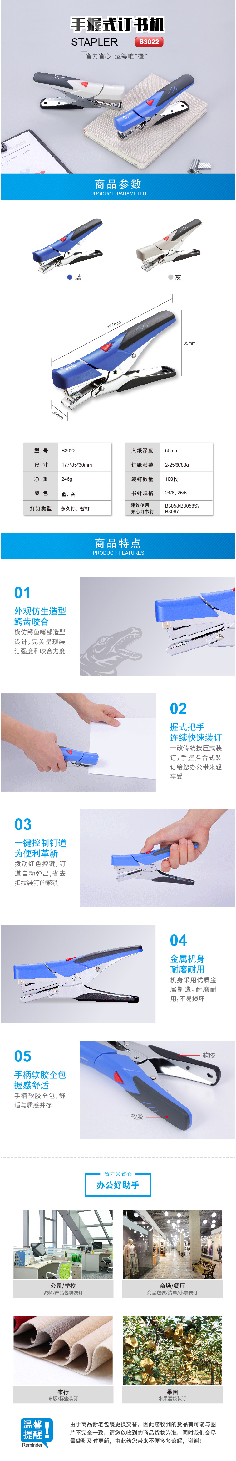 商品名称:齐心 B3022 手握订书机 12号钉
