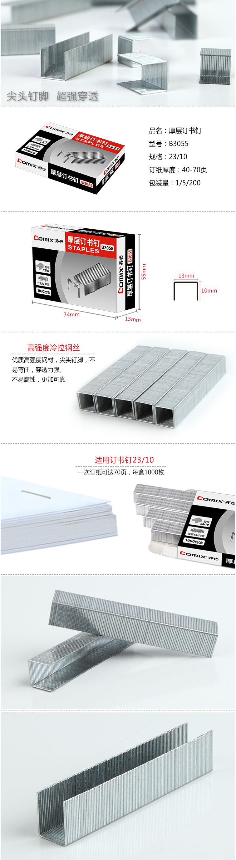 商品名称:齐心 B3055 厚层订书钉(23/10)70页 1000枚/盒
