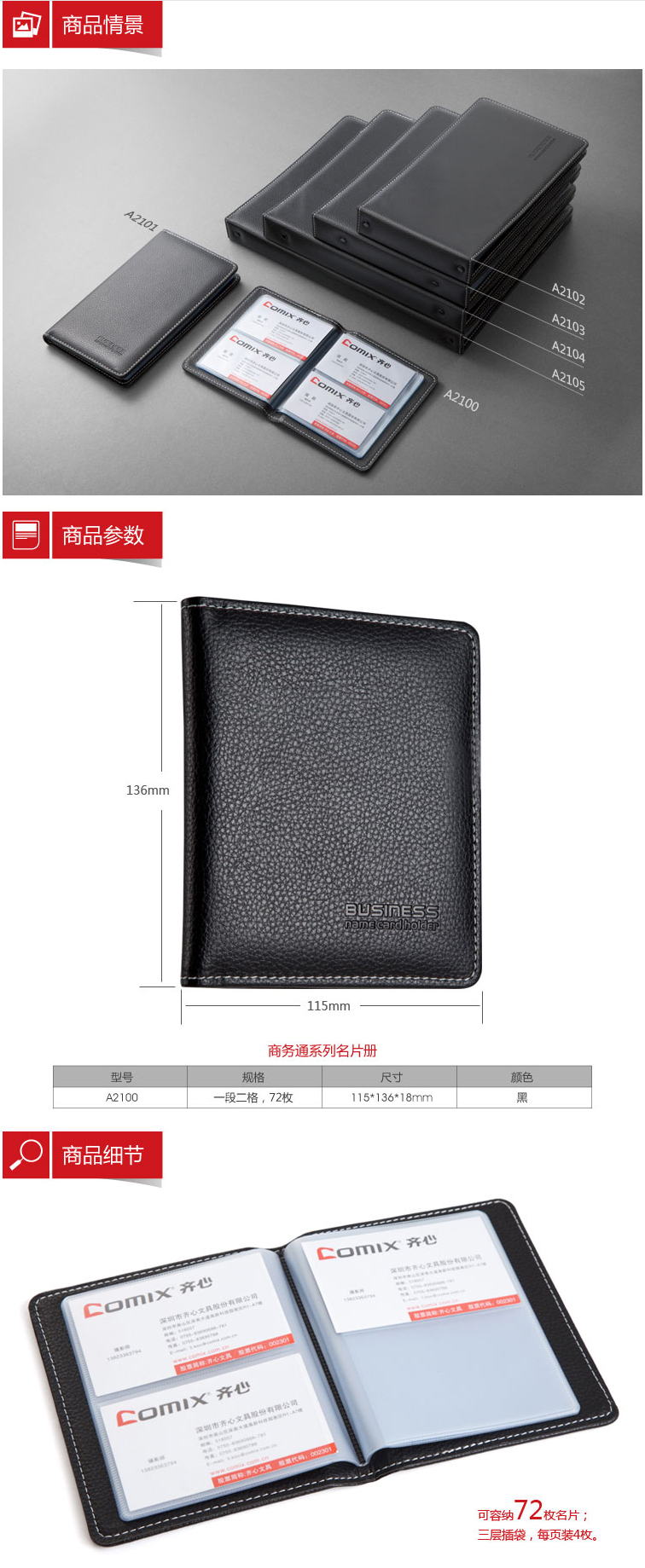 商品名称:齐心 A2100 商务名片册 一段二格/72枚