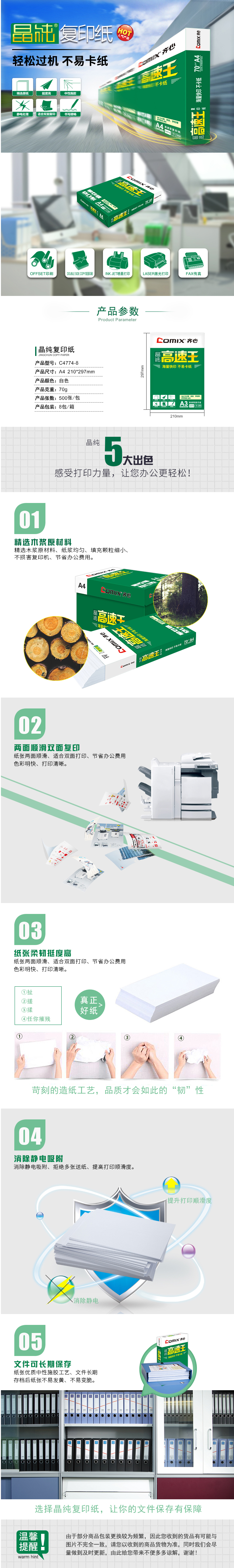 商品名称:齐心 C4774-8 晶纯高速王复印纸70克 A4 8包/件 35件/整卡板
