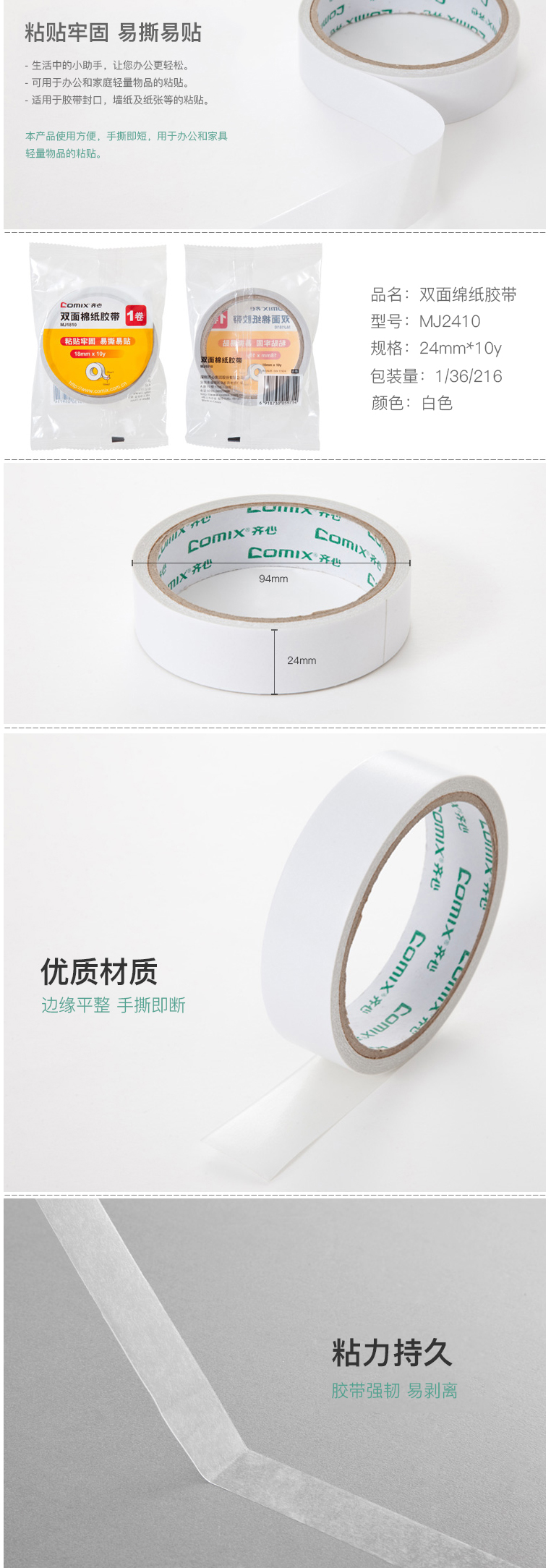 商品名称:齐心 MJ2410 双面棉纸胶带