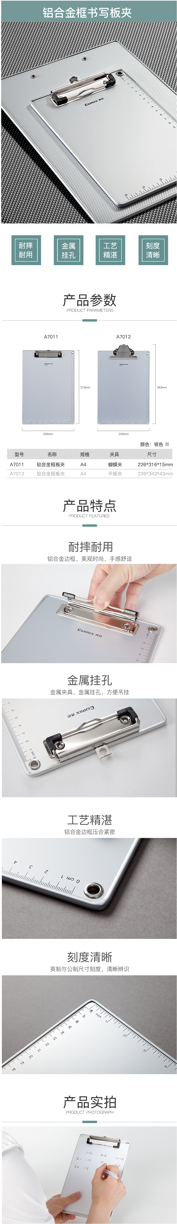 商品名称:齐心 A7011 高级铝合金平板夹 A4
