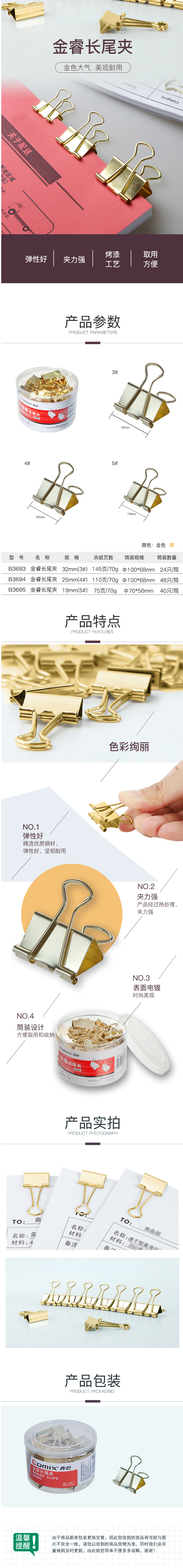 商品名称:齐心 B3695 金色长尾票夹 5号 40只/筒