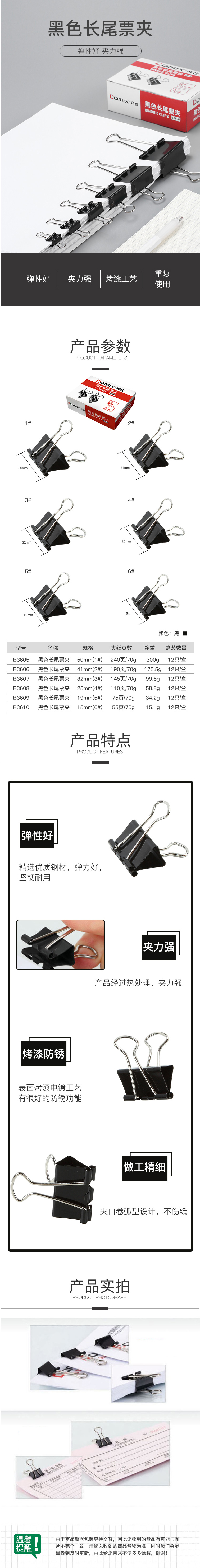 商品名称:齐心 B3610黑色长尾票夹 6# 15mm 12只/盒