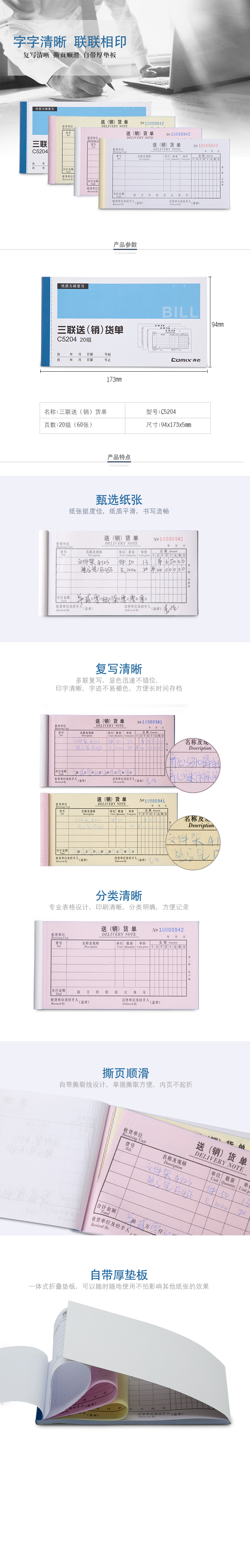 商品名称:齐心 C5204 三联送(销)货单(横版) 48K