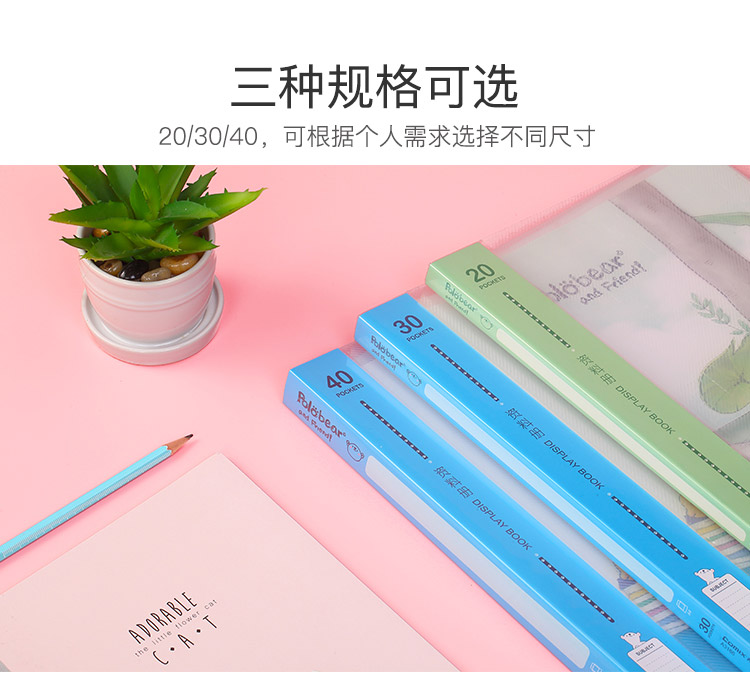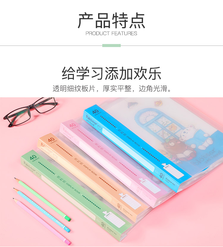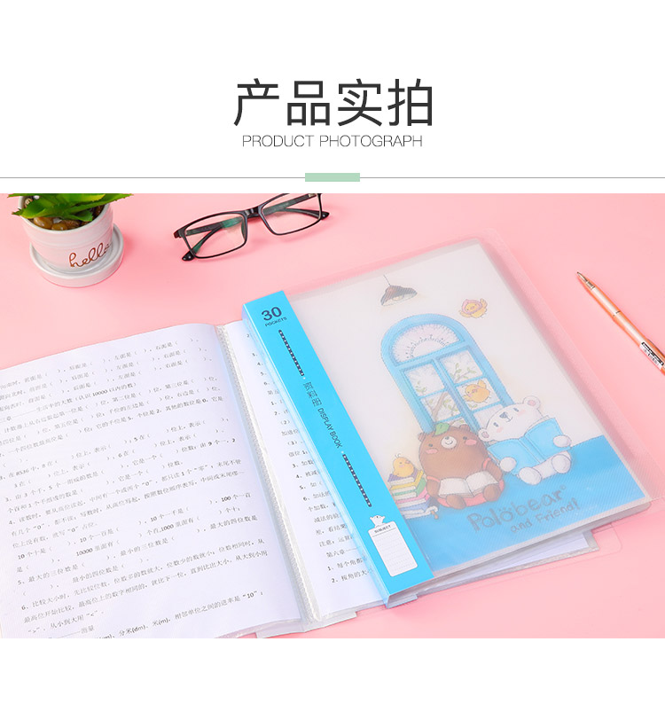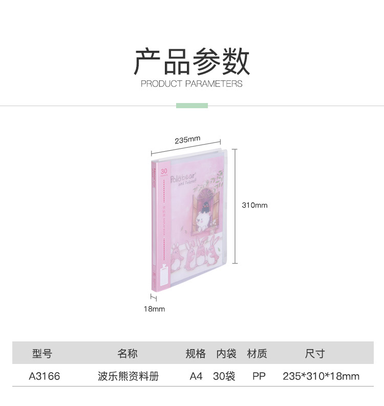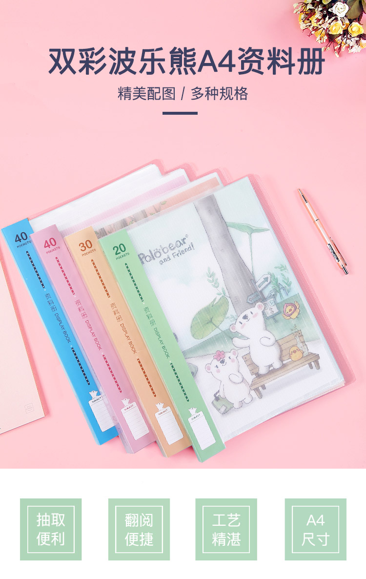商品名称:齐心 A3166 A4 资料册 双面彩页波乐熊 30袋 四色 配