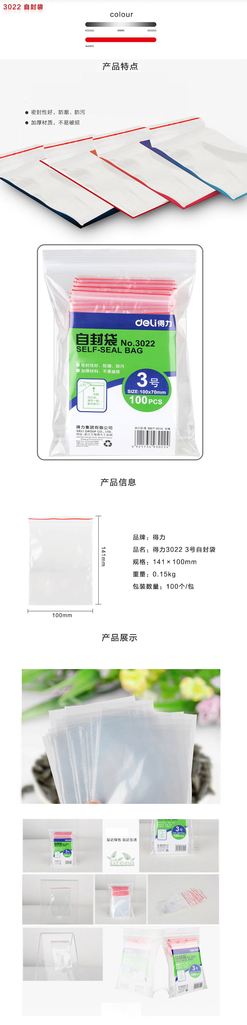 商品名称:得力3022自封袋(透明)-3号(100个/包)100x70mm0.04mm