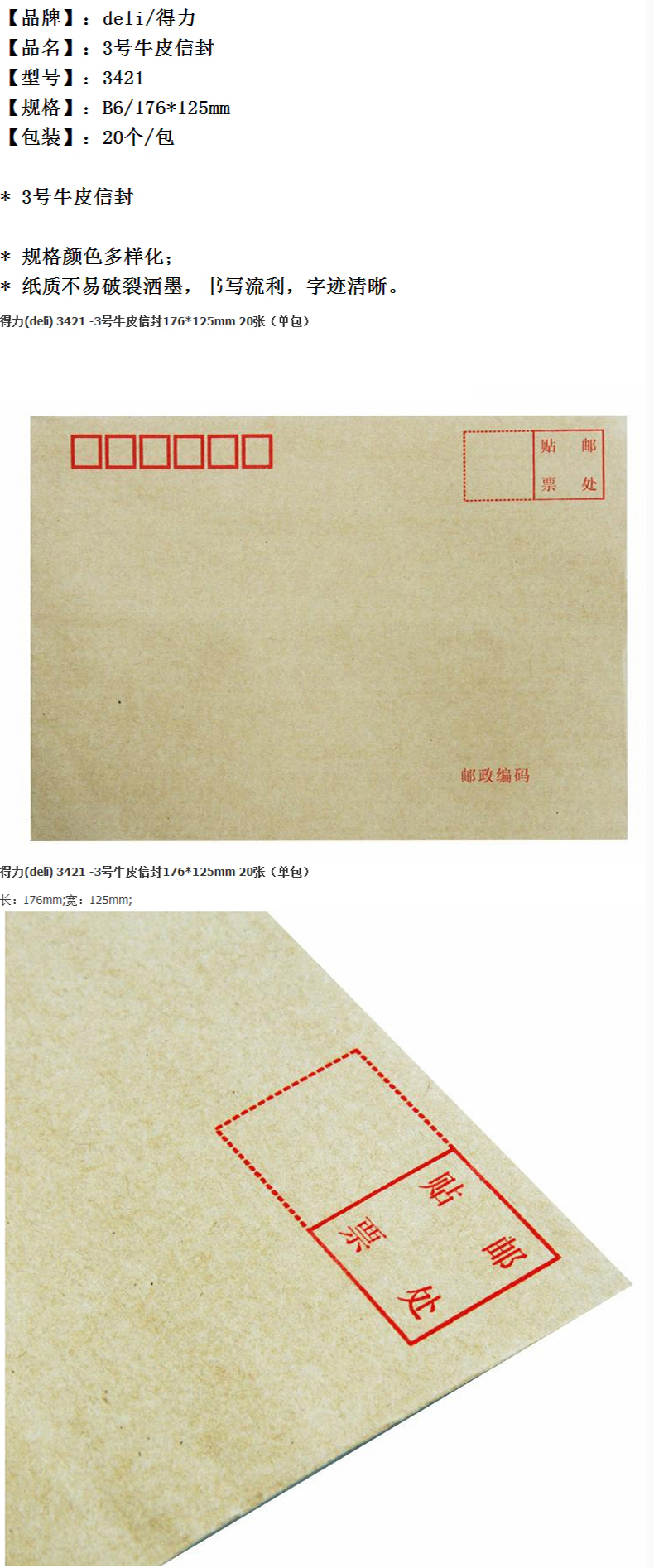 商品名称:得力3421牛皮信封(米黄色)-3号(20个/包)