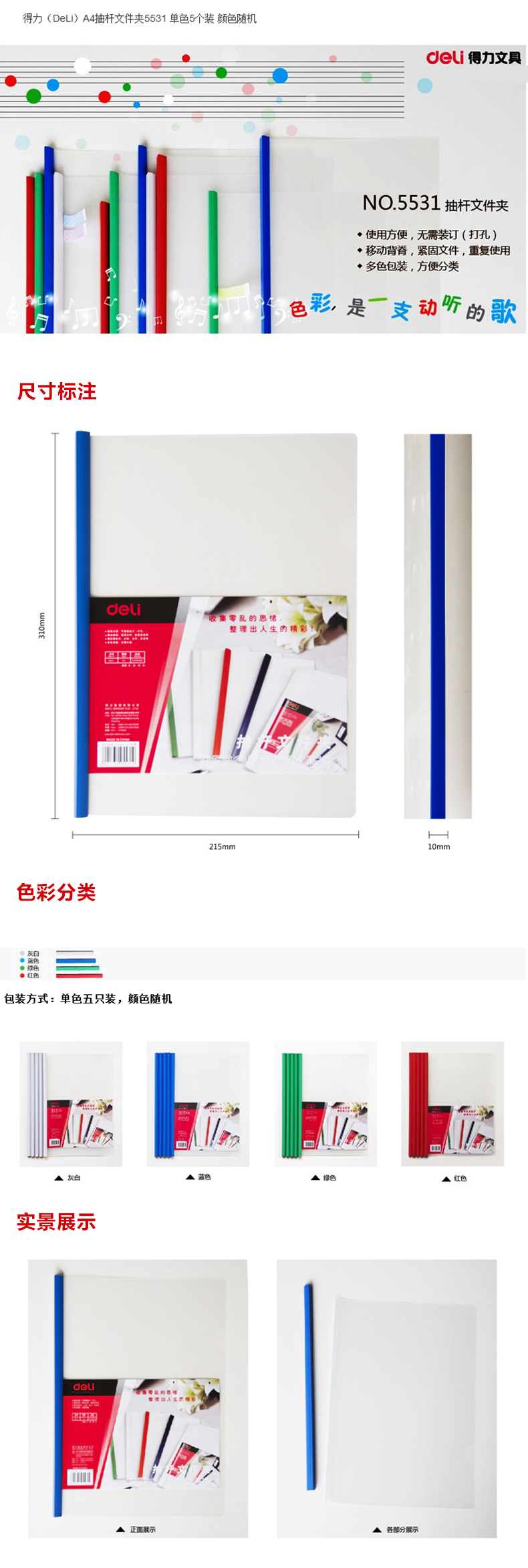 商品名称:得力5531抽杆夹(混)(5只/包)