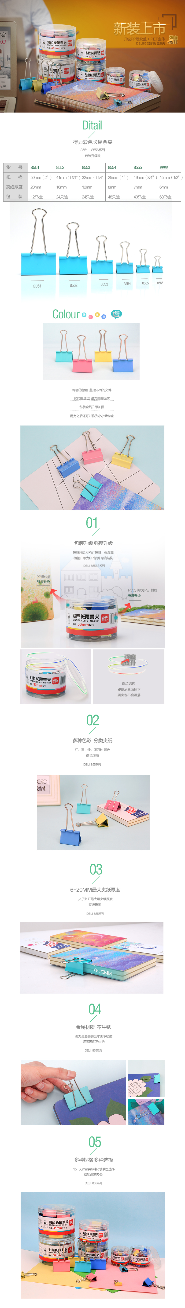 商品名称:得力8556-6#彩色长尾票夹15mm(筒装)(混)(60只/筒)