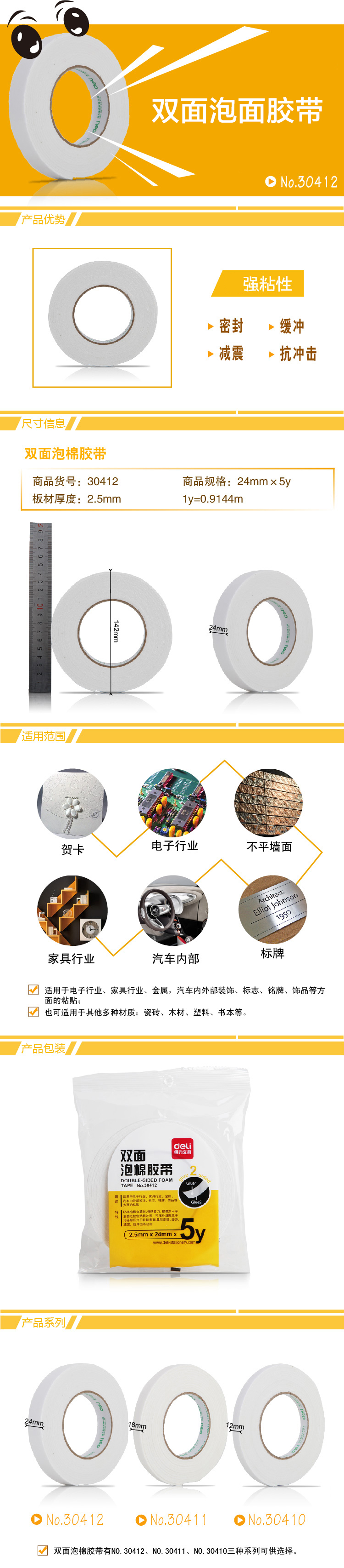 商品名称:得力30412EVA泡棉双面胶带24mm*5y*2.5mm(白)(1卷/袋)