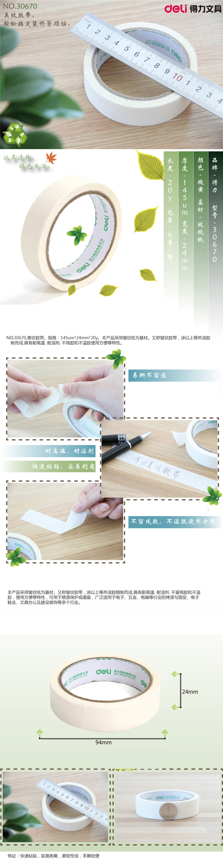 商品名称:得力30670美纹纸胶带24mm*20y*145um(微黄)(6卷/筒)