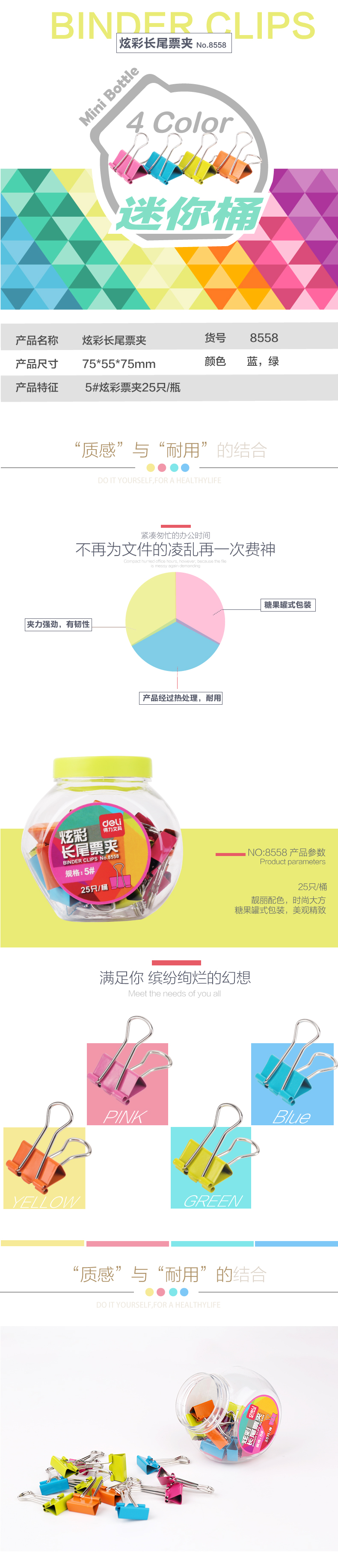 商品名称:得力8558长尾票夹(混)(25只/桶)