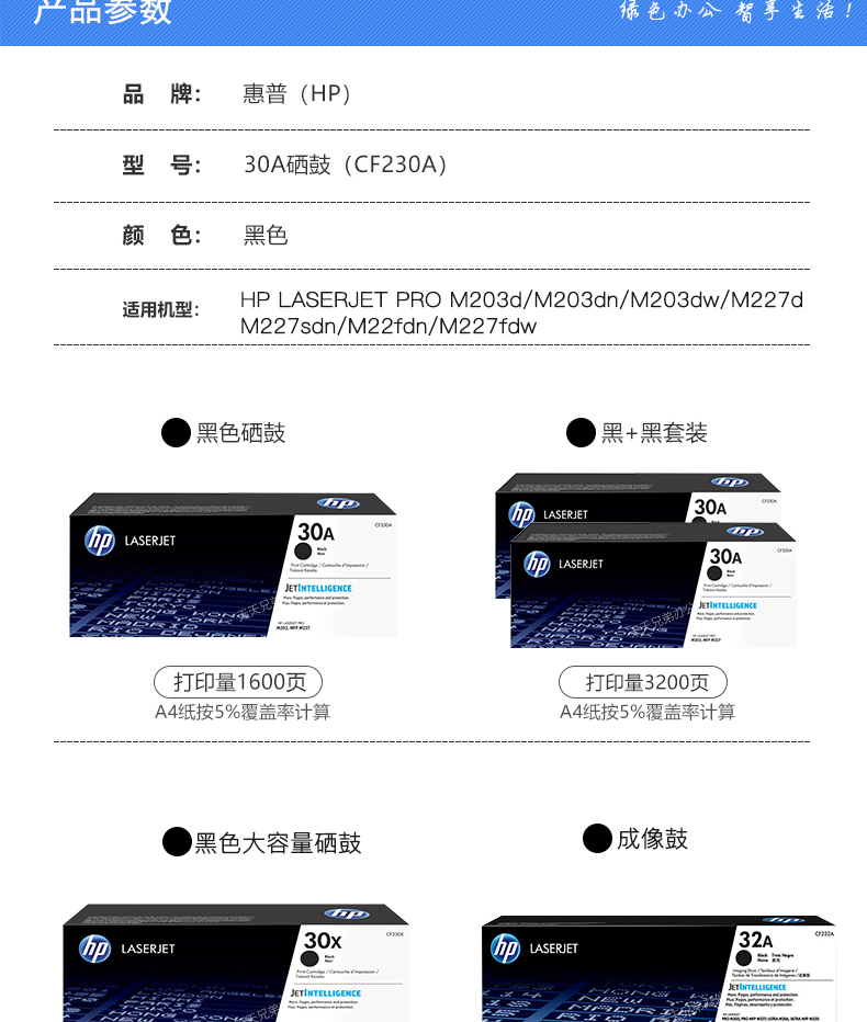 商品名称:惠普30a硒鼓m227fdw m227sdn m227fdn d m203dw dn粉盒墨盒 30a黑色碳粉盒cf230a打印机墨粉盒1600页