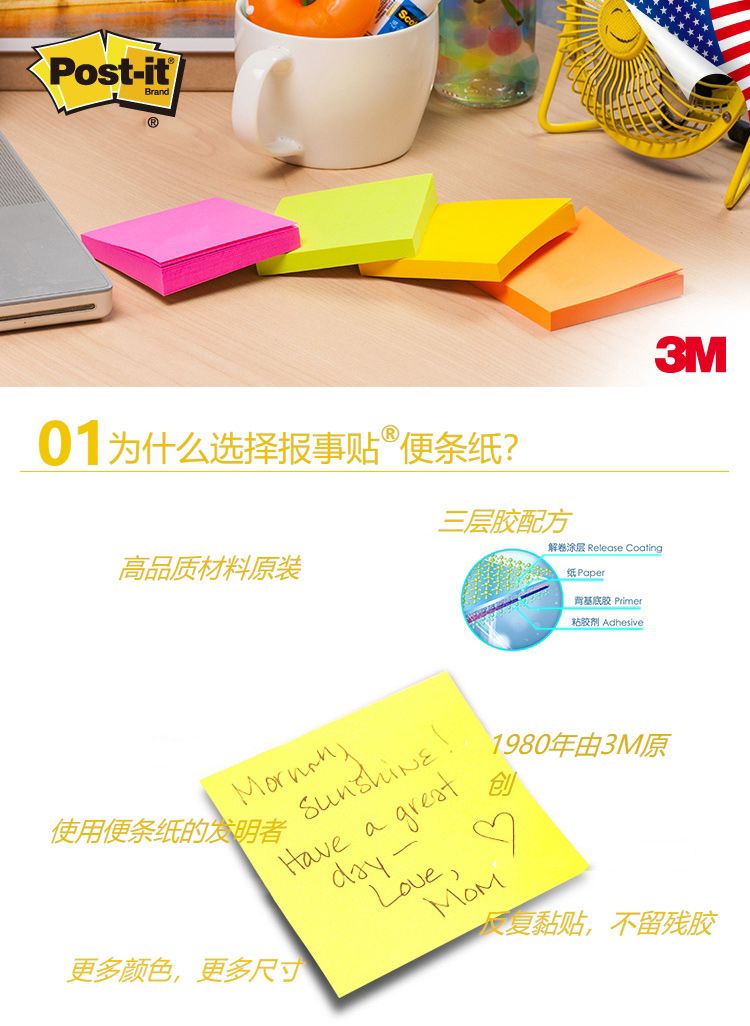 > 3M 便利贴 报事贴/便条纸/便签纸/便签本 合宜系列办公用品 72*76 4色彩色报事贴 654B-4P