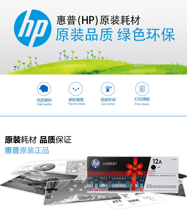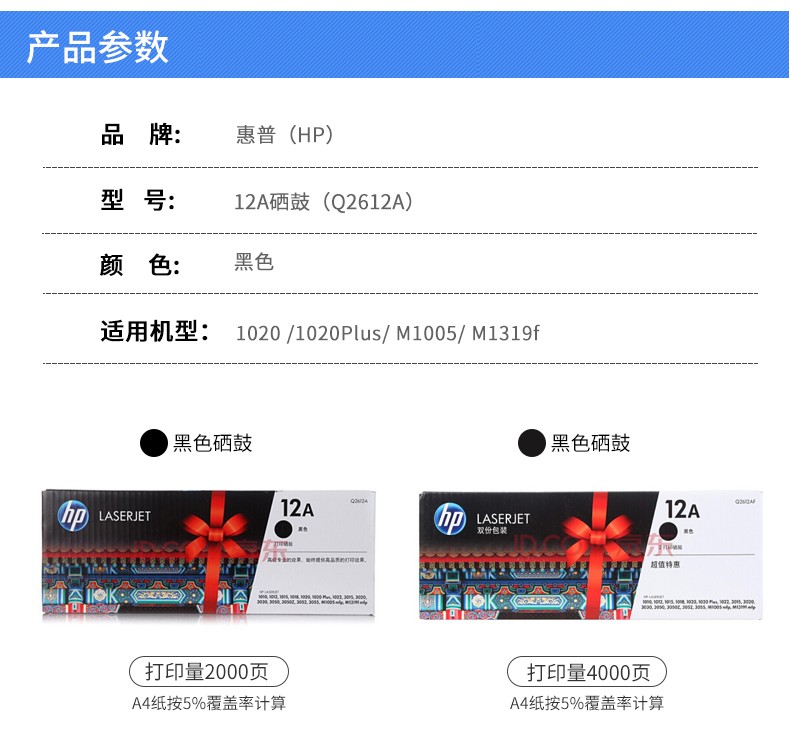商品名称:惠普(HP)12a硒鼓 2612A 原装硒鼓 粉盒 适用于1020 1005 1319 Q2612A单支 约2000张