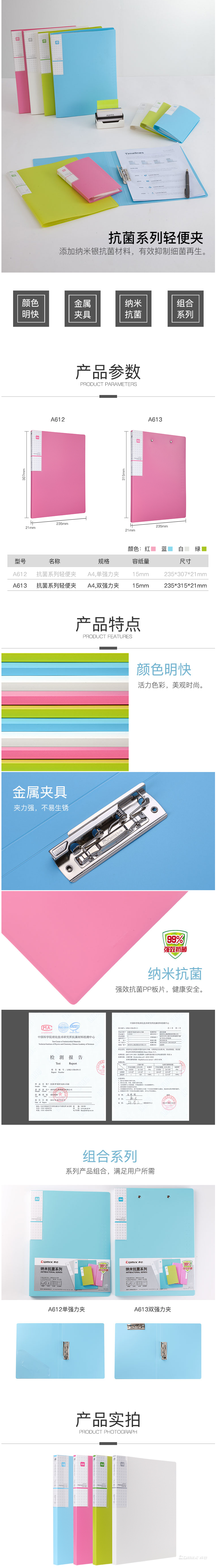 商品名称:齐心 A613 抗菌轻便夹 A4 双强力夹