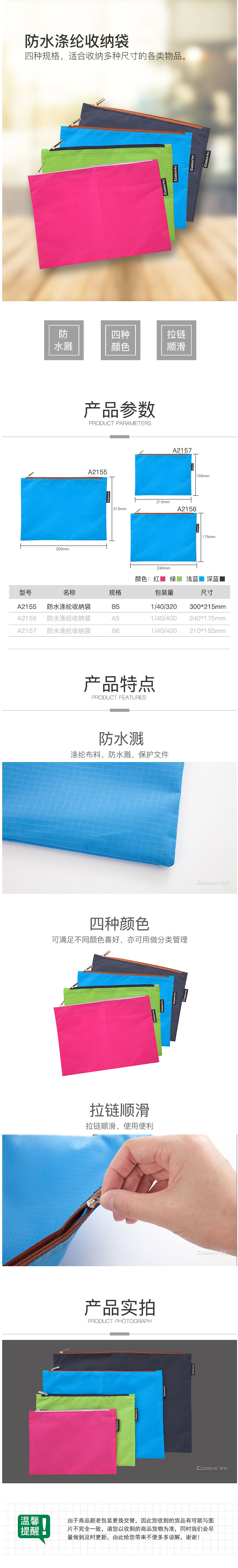 商品名称:齐心 A2155 单层彩色防水涤纶收纳袋 B5
